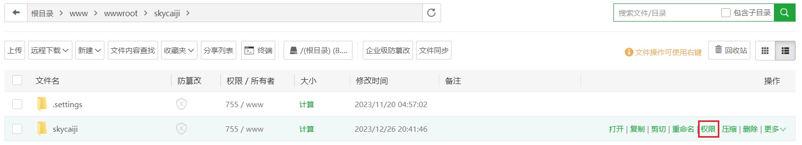 需要设置web执行命令的权限,以宝塔面板为例,打开站点目录,在根目录文件夹中点击“权限”